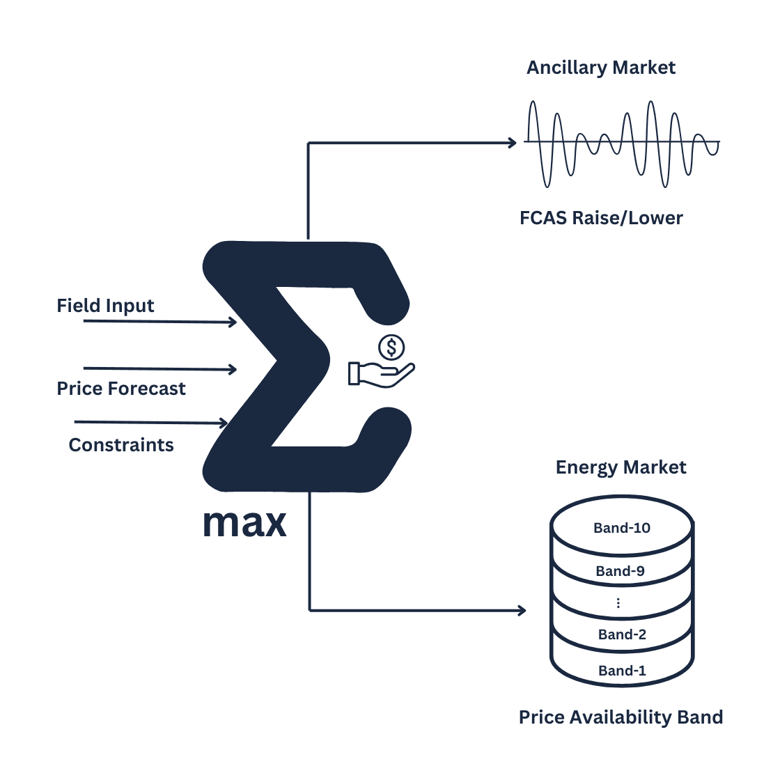 Sresht is our advanced bidding engine, meticulously designed to optimize participation in the wholesale energy and ancillary services markets including Frequency Control Ancillary Services. Unlike traditional bidding systems that separate strategies for determining bid quantities and allocating these across price bands, Sresht employs a groundbreaking co-optimization approach. This process combines both decisions into a single, efficient step to generate optimal price availability bands that adapt seamlessly to market dynamics.